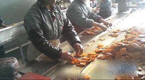 一款“愛情王子”辣條是由平江縣三陽鄉(xiāng)萬古村“鈞力食品”廠生產(chǎn)的。在生產(chǎn)車間,面粉被膨化后拉成絲,由于自動(dòng)抽絲的機(jī)器出了故障,面筋絲在運(yùn)轉(zhuǎn)中斷裂,掉落在了地上。這時(shí),一名工人順手抓起落在地上的面筋絲,放到了機(jī)器里,整個(gè)過程中,面筋不斷在地上拖動(dòng),嚴(yán)格的食品生產(chǎn)衛(wèi)生操作規(guī)范,在這里成了一紙空文。