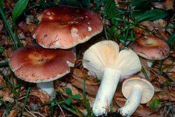 中毒類型屬于橫紋肌溶解型。菌蓋表面淺灰色至煤灰黑色,菌蓋直徑6-12cm,成熟后中部下凹呈漏斗狀。菌柄粗短,一般5-9cm,淺灰色,內部松軟。菌褶白色,受傷后易變紅色。菌肉白色,受傷后易變紅色而不再變黑色。劇毒,近年來在貴州省常有發生中毒事件,病死率極高。該菌與老百姓經常采食的紅菇屬中的其它種類如稀褶紅菇、密褶紅菇極為相似,老百姓都稱為火炭菌,很難從外觀形態上將他們區分開來。多在進食毒蘑菇15分鐘至2小時發病,初出現惡心、嘔吐、腹瀉、腹痛等胃腸道癥狀,6-12小時后出現出血尿或血紅蛋白尿、肌肉痙攣性疼痛、肌酸激酶急劇增加等橫紋肌溶解的癥狀,最后出現急性腎功能衰竭,甚至死亡。