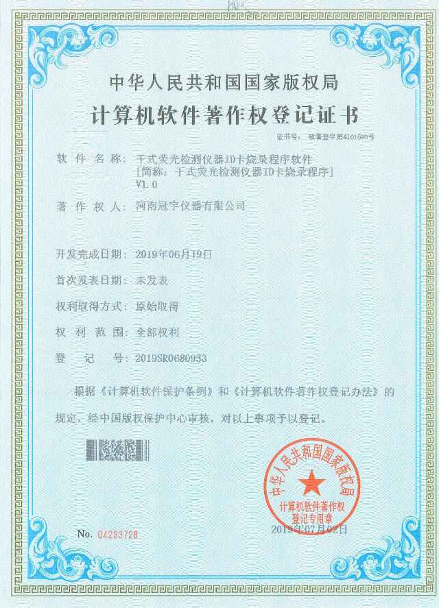 近日,河南冠宇儀器有限公司(以下簡(jiǎn)稱:冠宇儀器)繼之前的多項(xiàng)軟件著作權(quán)證書(shū)及專利證書(shū)之后,又獲由中華人民共和國(guó)國(guó)家版權(quán)局頒發(fā)的一項(xiàng)“干式熒光檢測(cè)儀器ID卡燒錄程序計(jì)算機(jī)軟件著作權(quán)登記證書(shū)”,一系列的權(quán)威肯定,彰顯了冠宇儀器強(qiáng)大的技術(shù)研發(fā)能力,也體現(xiàn)出公司為客戶提供優(yōu)質(zhì)產(chǎn)品的強(qiáng)大決心。