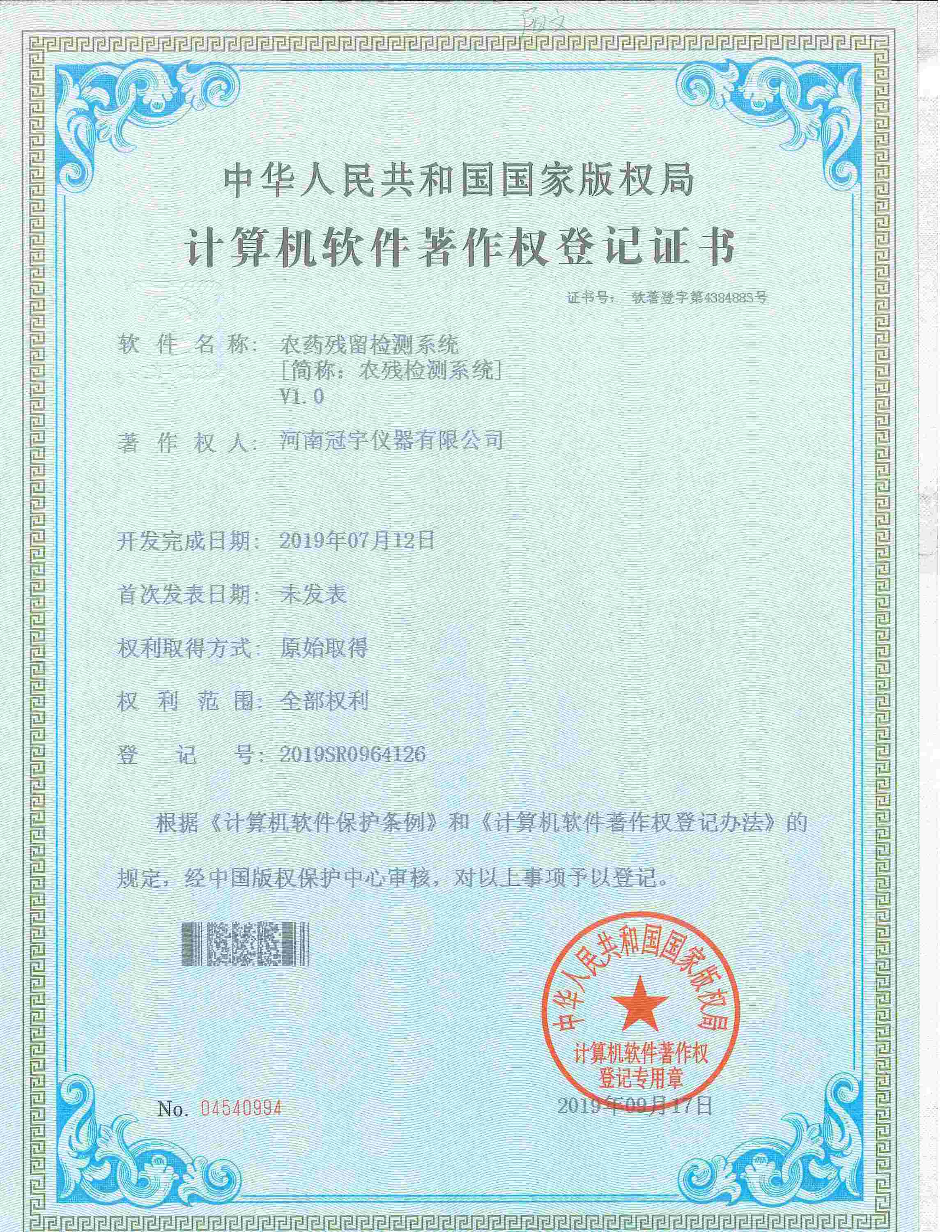 近日,河南冠宇儀器有限公司(以下簡稱:冠宇儀器)繼之前的多項(xiàng)軟件著作權(quán)證書及專利證書之后,又獲由中華人民共和國國家版權(quán)局頒發(fā)的一項(xiàng)“農(nóng)藥殘留檢測系統(tǒng)計(jì)算機(jī)軟件著作權(quán)登記證書”,一系列的權(quán)威肯定,彰顯了冠宇儀器強(qiáng)大的技術(shù)研發(fā)能力,也體現(xiàn)出公司為客戶提供優(yōu)質(zhì)產(chǎn)品的強(qiáng)大決心。