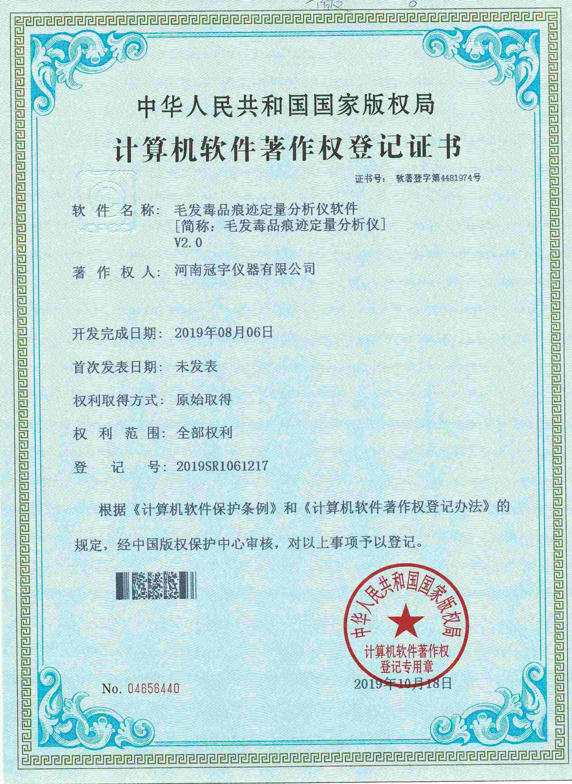 近日,河南冠宇儀器有限公司(以下簡稱:冠宇儀器)繼之前的多項軟件著作權證書及專利證書之后,又獲由中華人民共和國國家版權局頒發的一項“手持式毛反毒品痕跡定量分析儀計算機軟件著作權登記證書”,一系列的權威肯定,彰顯了冠宇儀器強大的技術研發能力,也體現出公司為客戶提供優質產品的強大決心。