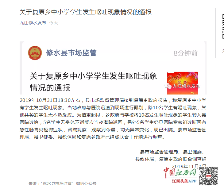10月31日,修水縣復原鄉中小學學生發生嘔吐事件,當日下午80名學生被送至當地縣城醫院檢查,10名學生被收治。