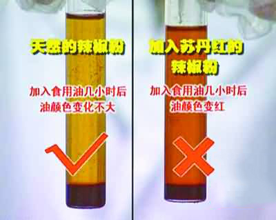 1.4:辣椒粉簡(jiǎn)易測(cè)試蘇丹紅方法:可將辣椒粉放入試管中,加入食用油。顏色變化不大,則可認(rèn)為無添加蘇丹紅,若顏色變紅,則認(rèn)為可能添加蘇丹紅等油溶性非食用色素。