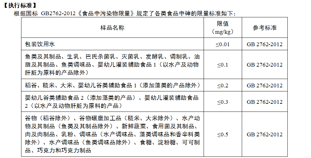 我國《食品安全國家標準 食品中污染物限量》(GB 2762-2012)中對谷物及其谷物碾磨加工品、糙米及大米、嬰幼兒谷物輔助食品(添加藻類的除外)、添加藻類的嬰幼兒谷物輔助食品等食品中的無機砷限量均做了明確要求,只要相關產品符合國家標準,對人體健康就不會造成產生危害。