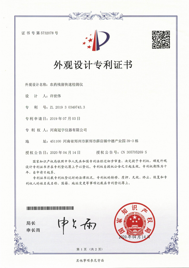 近日,河南冠宇儀器有限公司(以下簡稱:冠宇儀器)繼之前的多項軟件著作權(quán)證書及專利證書之后,又獲由國家知識產(chǎn)權(quán)局頒發(fā)的一項“農(nóng)藥殘留快速檢測儀外觀設(shè)計專利證書”,一系列的權(quán)威肯定,彰顯了冠宇儀器強大的技術(shù)研發(fā)能力,也體現(xiàn)出公司為客戶提供優(yōu)質(zhì)產(chǎn)品的強大決心。