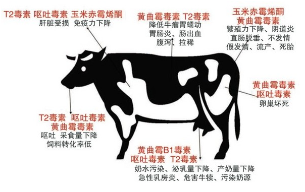 1.霉菌毒素中的黃曲霉毒素對牛的危害尤為嚴(yán)重,可引起牛肝壞死,導(dǎo)致牛胚胎死亡、先天性缺陷、腫瘤以及抑制免疫系統(tǒng)疾病,亦可導(dǎo)致機體出現(xiàn)神經(jīng)癥狀。另據(jù)研究表明, 牛飼料中黃曲霉毒素污染與亞臨床蹄葉炎和卵巢囊腫有直接正相關(guān)。