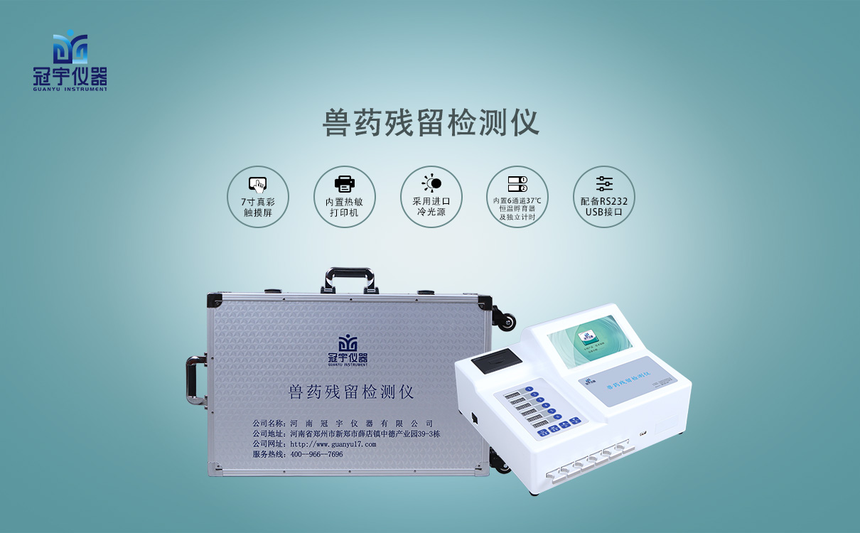綜上,必須采取有效措施,減少和控制獸藥殘留的發生。河南冠宇儀器有限公司研制出一款獸藥殘留檢測儀可現場檢測食品、肉制品、糧食、化妝品、食用油等樣品中抗生素殘留、毒素、激素及非法添加。如:氯霉素、氰霉素、鹽酸克侖特羅、萊克多巴胺、沙丁胺醇、黃曲霉毒素等數十種項目。應用競爭抑制免疫層析的原理,通過檢測線熒光定量卡中的熒光強弱程度,定量分析待檢樣品中獸藥殘留。廣泛應用于食品藥品監督管理局,高等院校,科研院所,農業部門,衛生部門,屠宰場,畜牧獸醫,農場,食品肉制品深加工企業,檢驗檢疫部門。