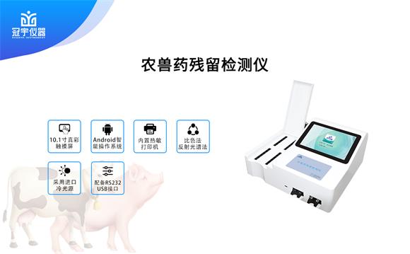 食品檢驗部門要加強對農獸藥殘留進行檢測,冠宇儀器農獸藥殘留檢測儀可現場快速檢測農藥殘留(有機磷類農藥殘留、氨基甲酸酯類農藥殘留、菊酯類農藥殘留、有機氯類農藥殘留等)、獸藥殘留(鹽酸克倫特羅、萊克多巴胺、沙丁胺醇、恩諾沙星、氯霉素、磺胺類、喹喏酮類、呋喃類、四環素類、阿莫西林、孔雀石綠、黃曲霉毒素、環丙沙星、紅霉素、土霉素、喹乙醇、已烯雌酚等)。