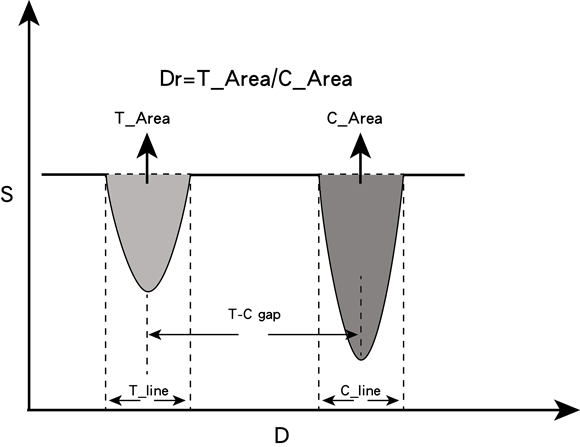 Dr值:通過光學傳感器獲得的信號曲線上T線對應峰面積(T_Area)與C線對應峰面積(C_Area)之比值。即:Dr值 = T_Area/C_Area,如圖2所示,為從儀器上獲得的信號曲線的對應關系。用標準條帶S0、S1、S2和S3檢測,記錄顯示屏顯示的Dr值。